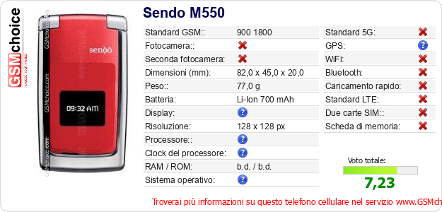 Dati del telefono cellulare Sendo M550 sul tuo sito