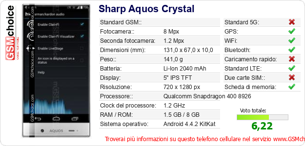Dati del telefono cellulare Sharp Aquos Crystal sul tuo sito