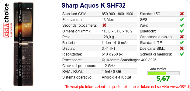 Dati del telefono cellulare Sharp Aquos K SHF32 sul tuo sito