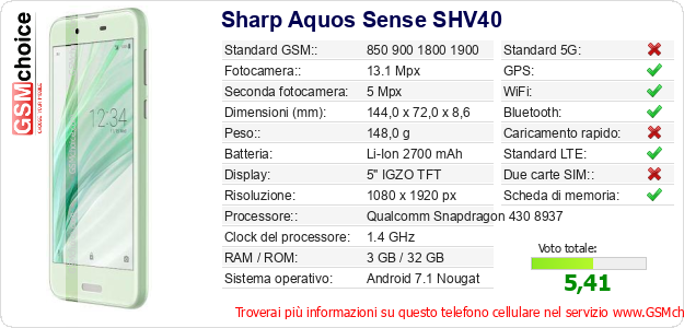 Dati del telefono cellulare Sharp Aquos Sense SHV40 sul tuo sito