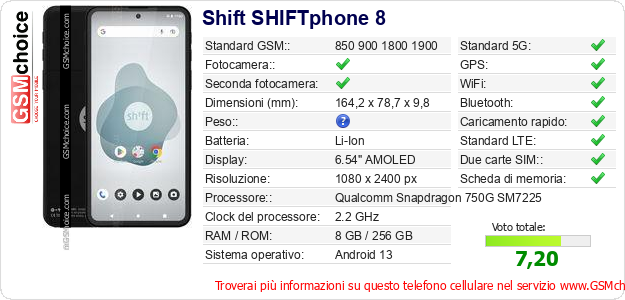 Dati del telefono cellulare Shift SHIFTphone 8 sul tuo sito