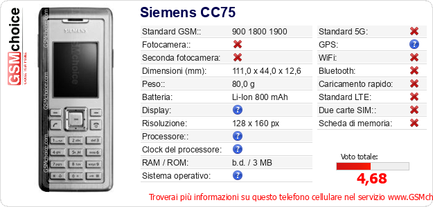 Dati del telefono cellulare Siemens CC75 sul tuo sito