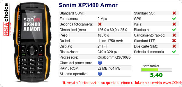 Dati del telefono cellulare Sonim XP3400 Armor sul tuo sito