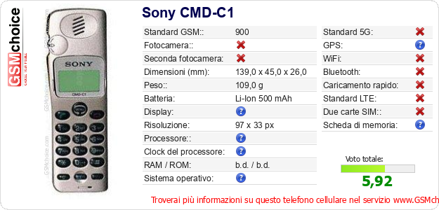 Dati del telefono cellulare Sony CMD-C1 sul tuo sito
