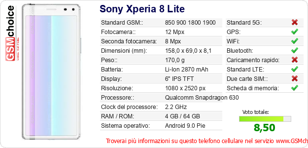 Dati del telefono cellulare Sony Xperia 8 Lite sul tuo sito