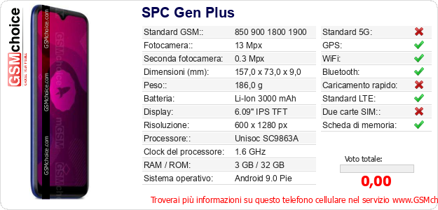 Dati del telefono cellulare SPC Gen Plus sul tuo sito