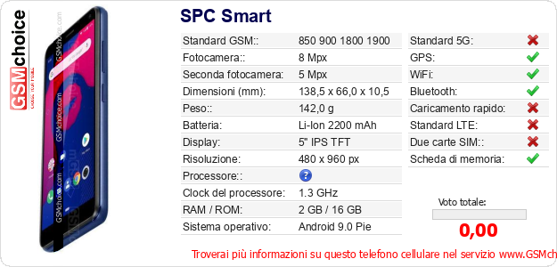 Dati del telefono cellulare SPC Smart sul tuo sito