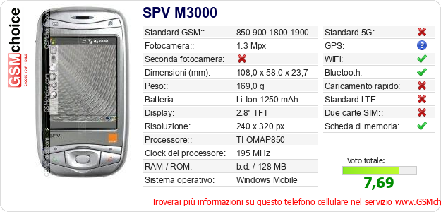 Dati del telefono cellulare SPV M3000 sul tuo sito