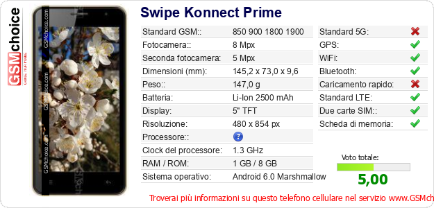 Dati del telefono cellulare Swipe Konnect Prime sul tuo sito