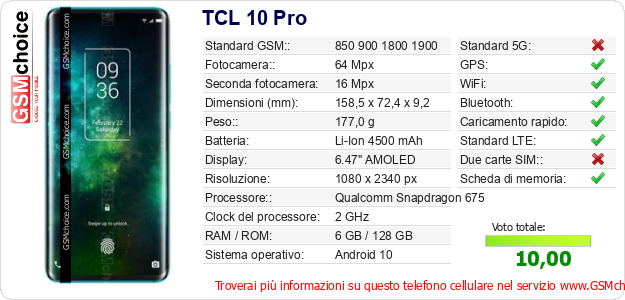 Dati del telefono cellulare TCL 10 Pro sul tuo sito