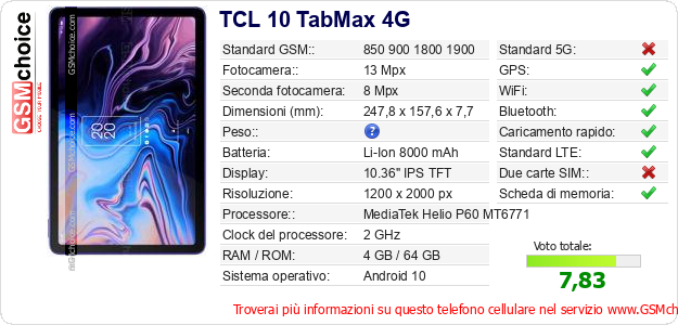 Dati del telefono cellulare TCL 10 TabMax 4G sul tuo sito