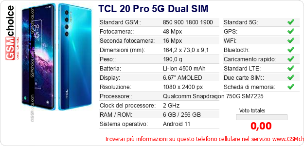 Dati del telefono cellulare TCL 20 Pro 5G Dual SIM sul tuo sito