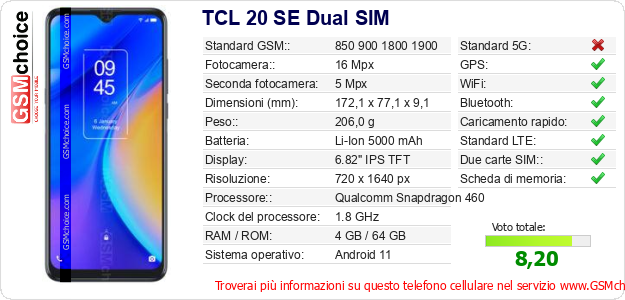 Dati del telefono cellulare TCL 20 SE Dual SIM sul tuo sito