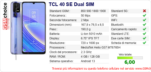 Dati del telefono cellulare TCL 40 SE Dual SIM sul tuo sito