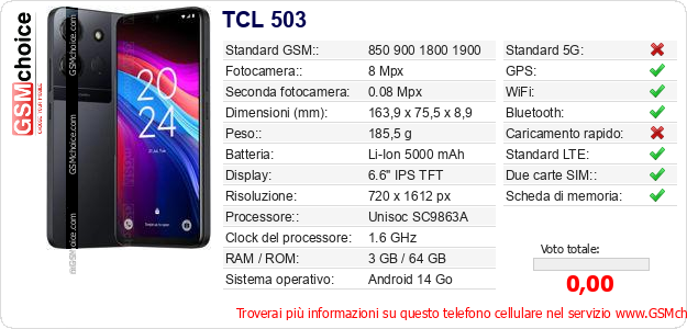 Dati del telefono cellulare TCL 503 sul tuo sito