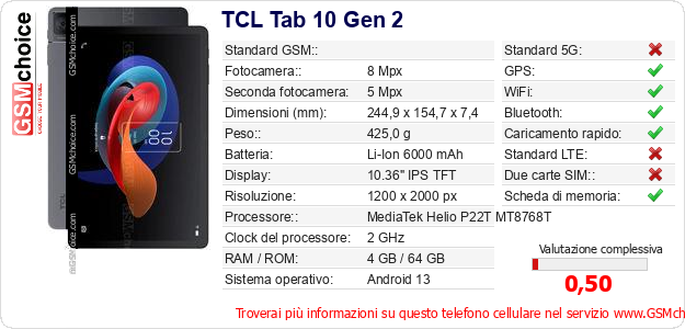 Dati del telefono cellulare TCL Tab 10 Gen 2 sul tuo sito