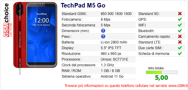 Dati del telefono cellulare TechPad M5 Go sul tuo sito