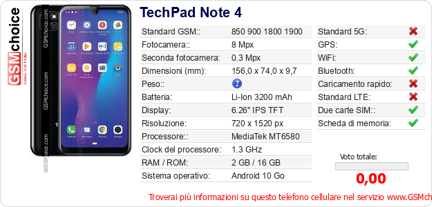 Dati del telefono cellulare TechPad Note 4 sul tuo sito