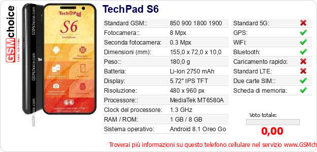 Dati del telefono cellulare TechPad S6 sul tuo sito
