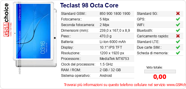 Dati del telefono cellulare Teclast 98 Octa Core sul tuo sito