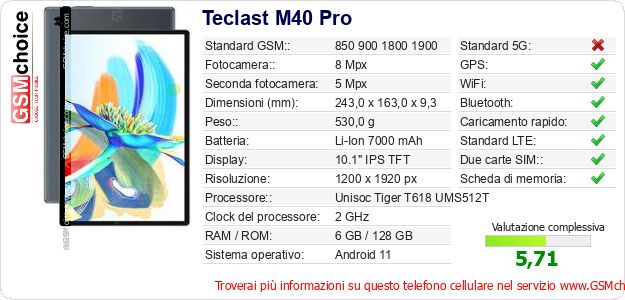 Dati del telefono cellulare Teclast M40 Pro sul tuo sito