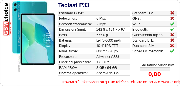 Dati del telefono cellulare Teclast P33 sul tuo sito
