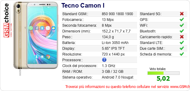 Dati del telefono cellulare Tecno Camon I sul tuo sito