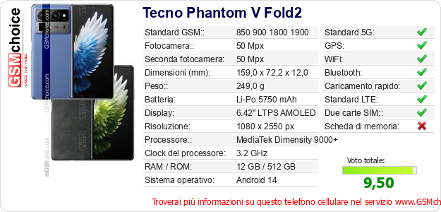Dati del telefono cellulare Tecno Phantom V Fold2 sul tuo sito
