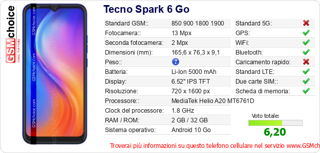 Dati del telefono cellulare Tecno Spark 6 Go sul tuo sito