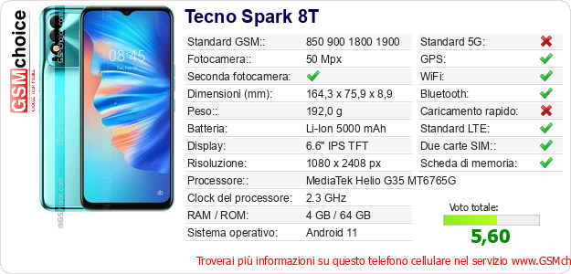 Dati del telefono cellulare Tecno Spark 8T sul tuo sito
