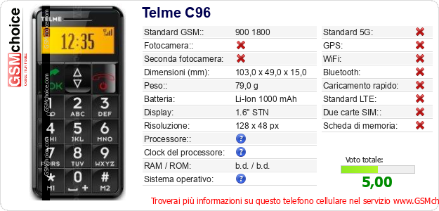 Dati del telefono cellulare Telme C96 sul tuo sito