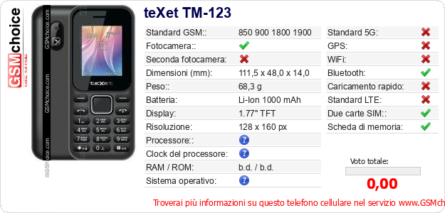 Dati del telefono cellulare teXet TM-123 sul tuo sito