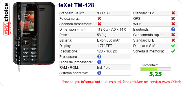 Dati del telefono cellulare teXet TM-128 sul tuo sito