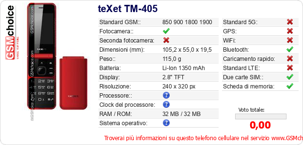 Dati del telefono cellulare teXet TM-405 sul tuo sito