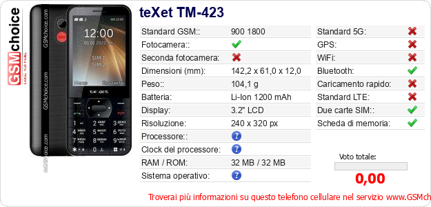 Dati del telefono cellulare teXet TM-423 sul tuo sito