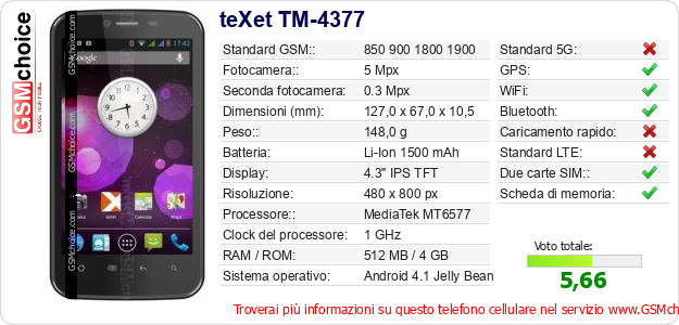 Dati del telefono cellulare teXet TM-4377 sul tuo sito