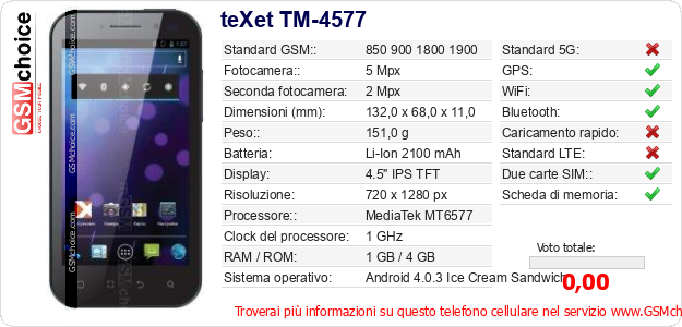 Dati del telefono cellulare teXet TM-4577 sul tuo sito