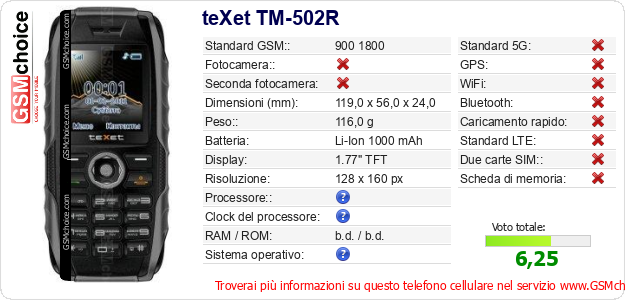 Dati del telefono cellulare teXet TM-502R sul tuo sito