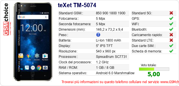 Dati del telefono cellulare teXet TM-5074 sul tuo sito