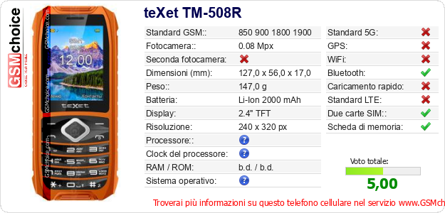 Dati del telefono cellulare teXet TM-508R sul tuo sito