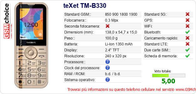 Dati del telefono cellulare teXet TM-B330 sul tuo sito