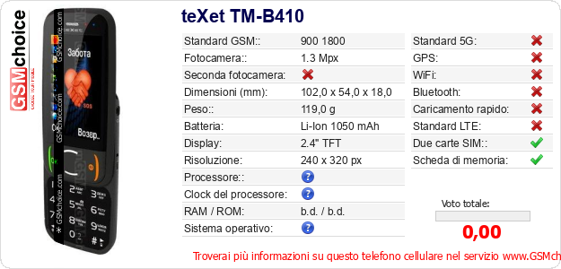 Dati del telefono cellulare teXet TM-B410 sul tuo sito