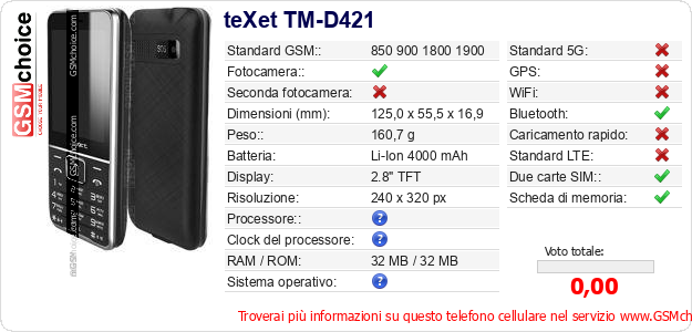 Dati del telefono cellulare teXet TM-D421 sul tuo sito