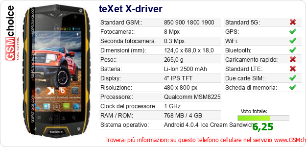 Dati del telefono cellulare teXet X-driver sul tuo sito