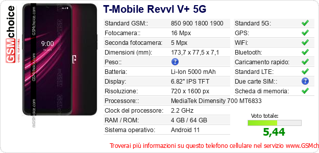 Dati del telefono cellulare T-Mobile Revvl V+ 5G sul tuo sito