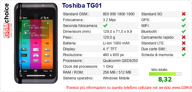 Dati del telefono cellulare Toshiba TG01 sul tuo sito
