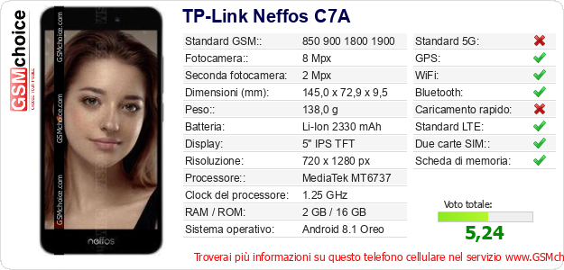 Dati del telefono cellulare TP-Link Neffos C7A sul tuo sito