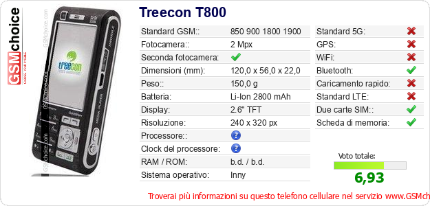 Dati del telefono cellulare Treecon T800 sul tuo sito