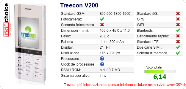 Dati del telefono cellulare Treecon V200 sul tuo sito