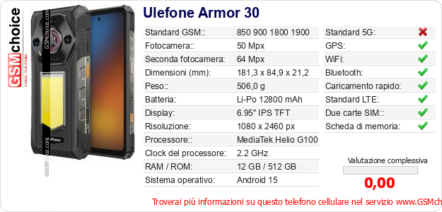 Dati del telefono cellulare Ulefone Armor 30 sul tuo sito